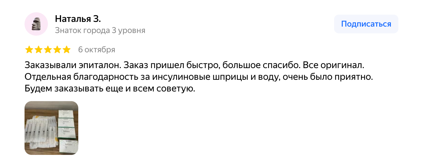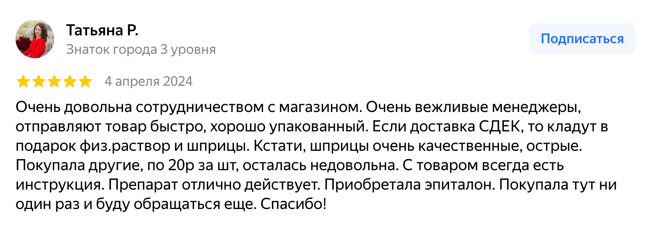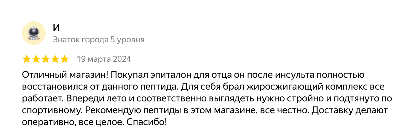 Почитать отзывы о доставке, обслуживании и качестве пептидов нашей компнии, а также оставить его, вы сможете на Яндекс картах.